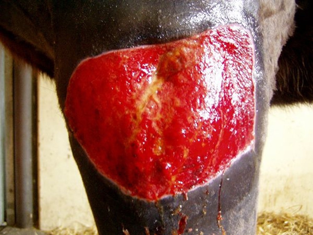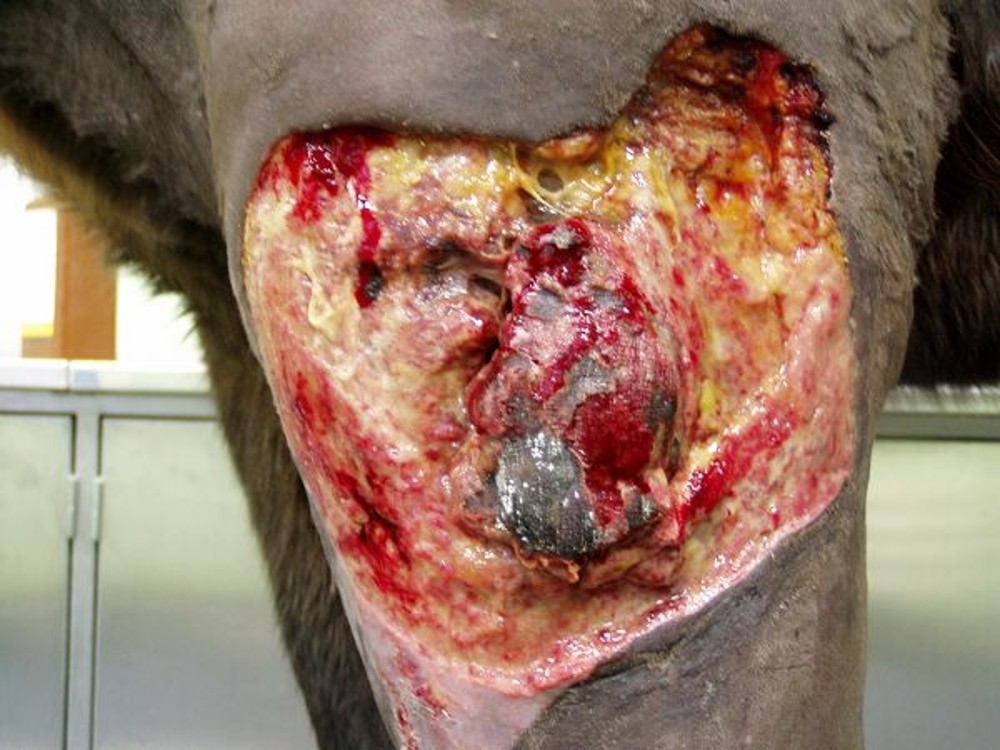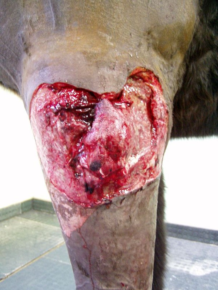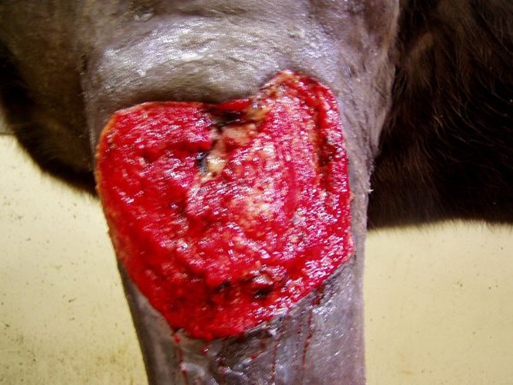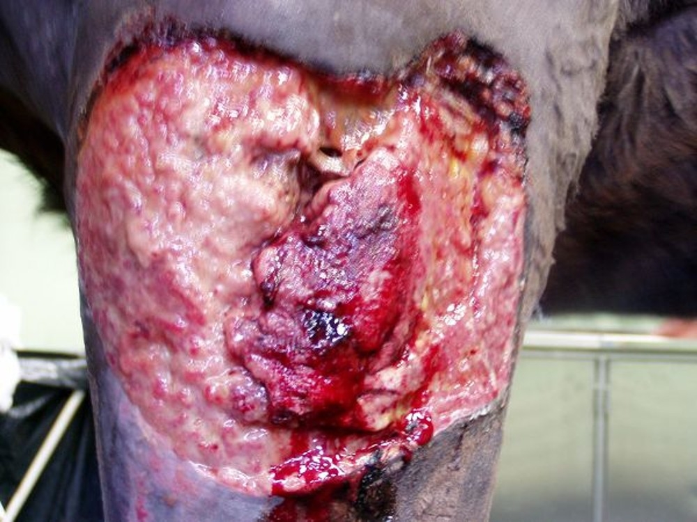Osmiletý valach si přivodil tržnou ránu v oblasti antebranchia hrudní končetiny. Po pěti dnech byl pacient přiveden na kliniku s nehojící se, silně secernující ránou o velikosti 35 x 50 cm. Revize ukázala poškození a ztrátu kůže, podkoží a laterální svaloviny a v ráně byly přítomny mnohočetné kapsy obsahující serózní až hnisavý výpotek s vysráženou masou fibrinu.
