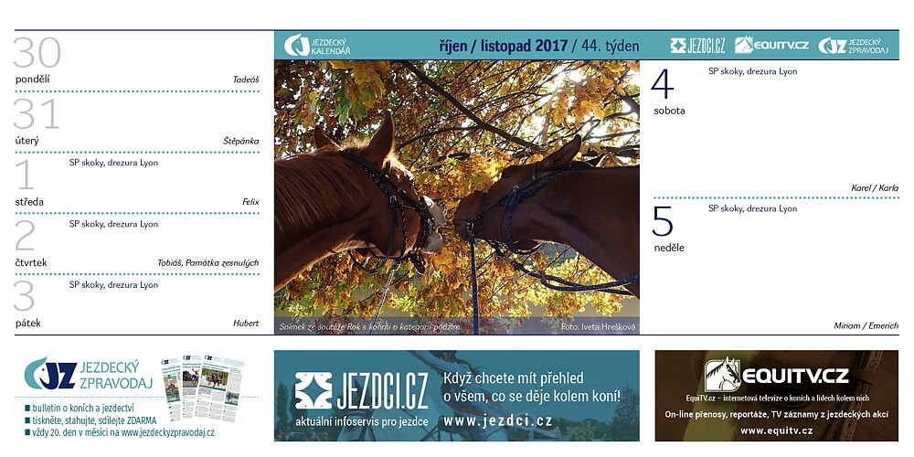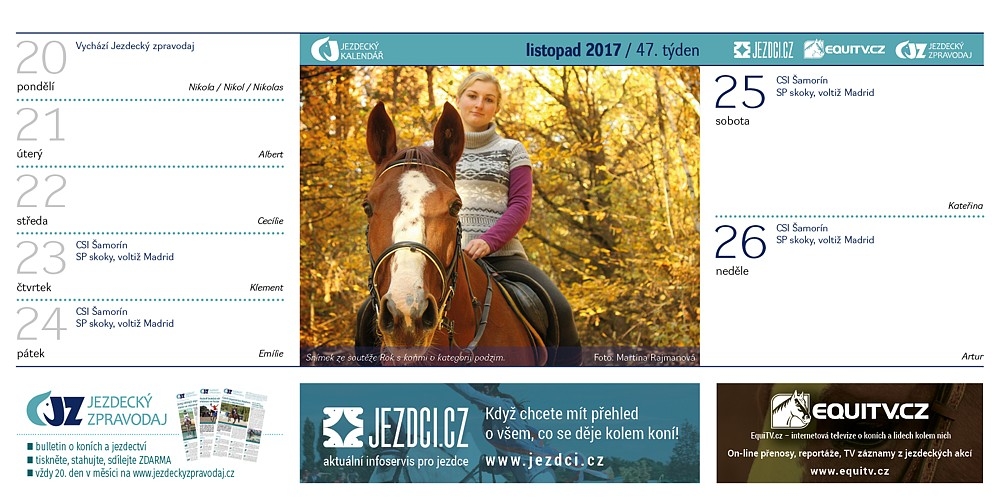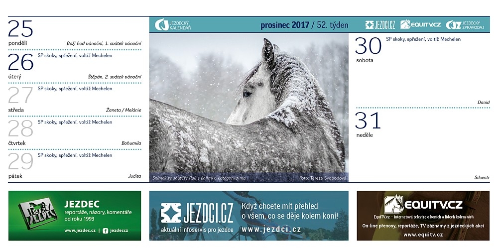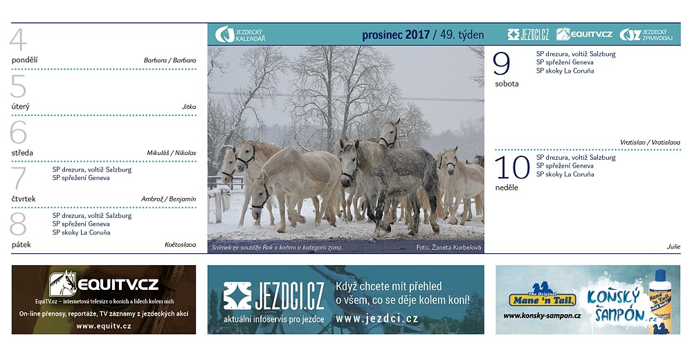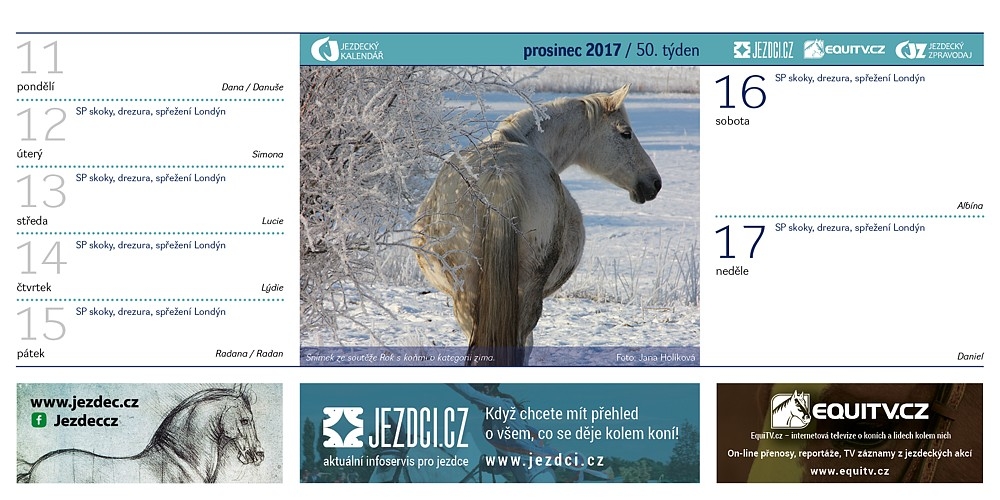 Také pro rok 2018 bude společnost Equinet vydávat Jezdecký kalendář. A i tentokrát se mohou na jeho stránky dostat fotografie fanoušku portálů EquiTV a Jezdci.cz. Podívejte se na přehled snímků, které byly zařazeny do kalendáře v roce 2017…