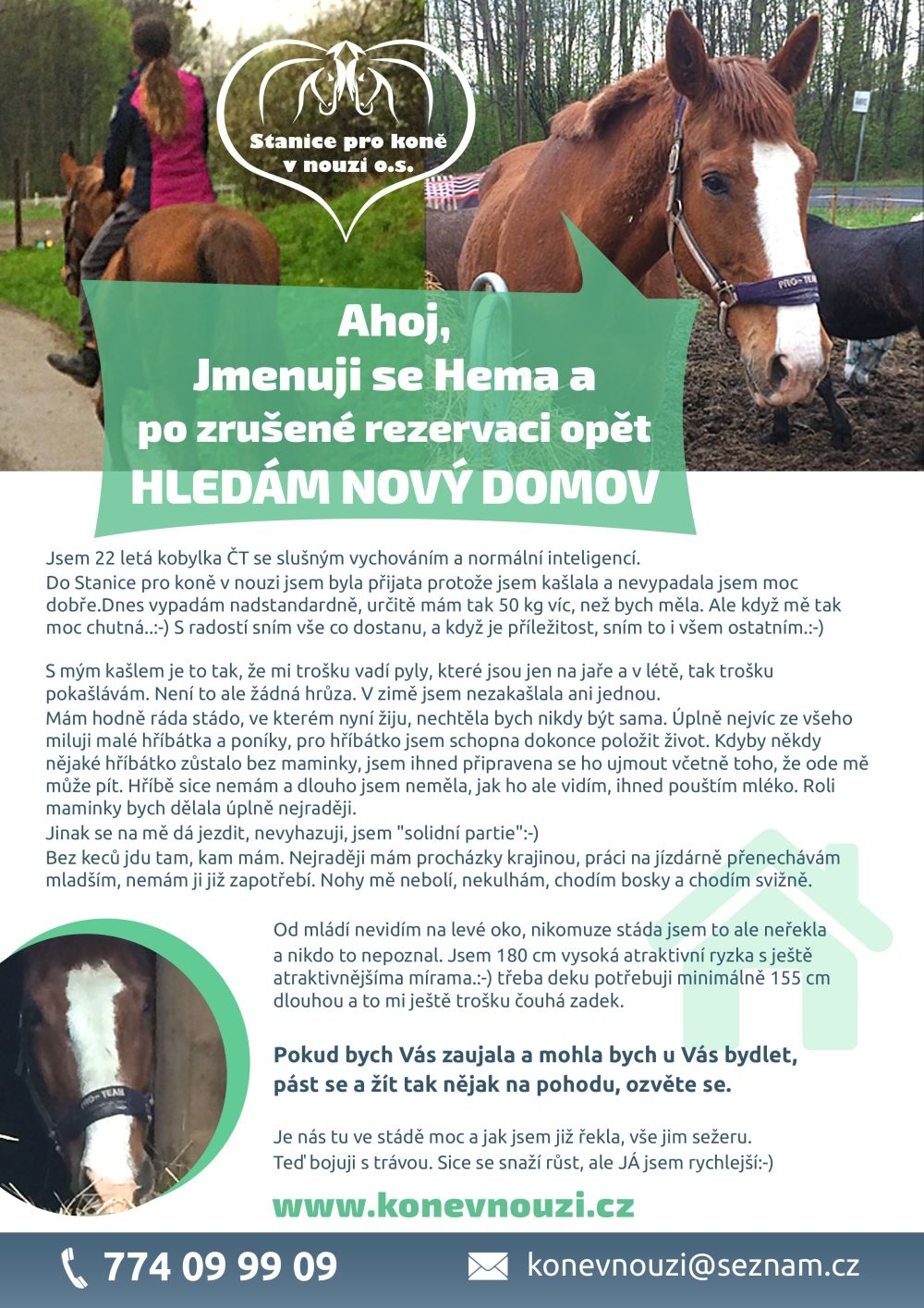 Stanice pro koně v nouzi naši redakci opět oslovila s žádostí o pomoc při hledání nového domova pro klisnu Hemu. Prostřednictvím našich médií se podařilo najít zájemce, ale ten si ji nakonec ani po 5 měsících nepřevzal a přestal komunikovat…