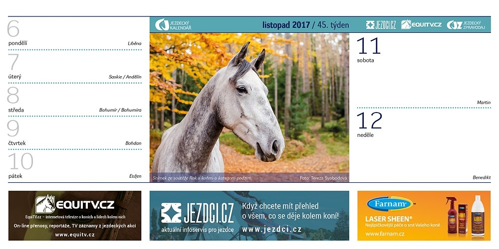 Jezdecký kalendář se od těch ostatních liší tím, že má vyhrazený výrazně větší prostor pro víkendové dny. Navíc jsou v něm uvedeny termíny důležitých jezdeckých akcí v České republice i jinde ve světě!