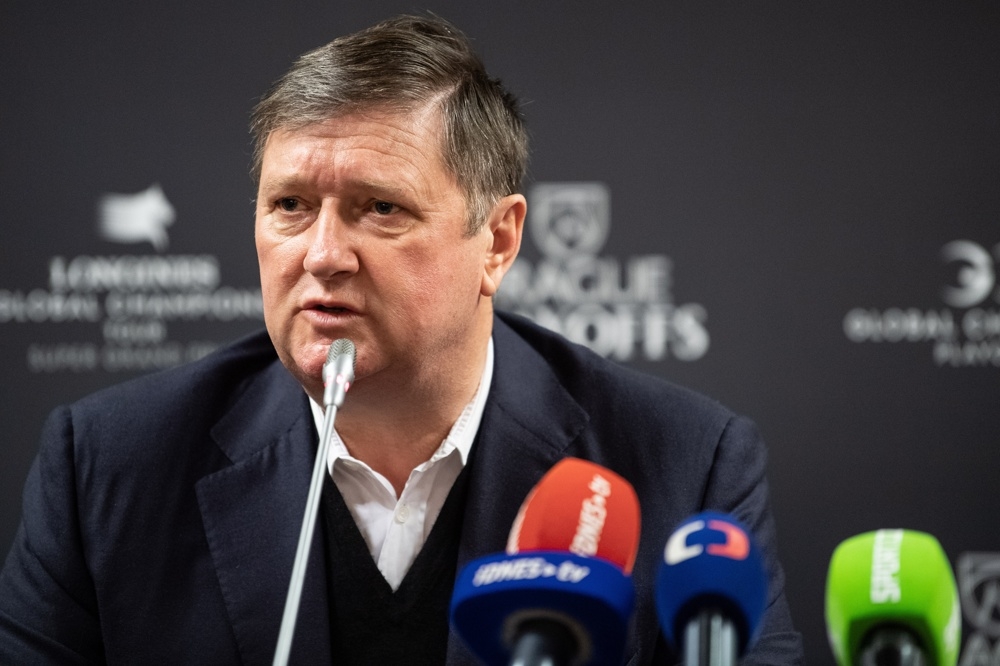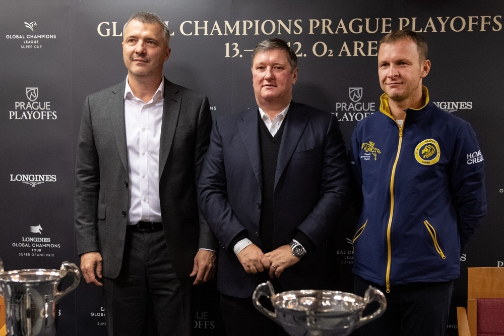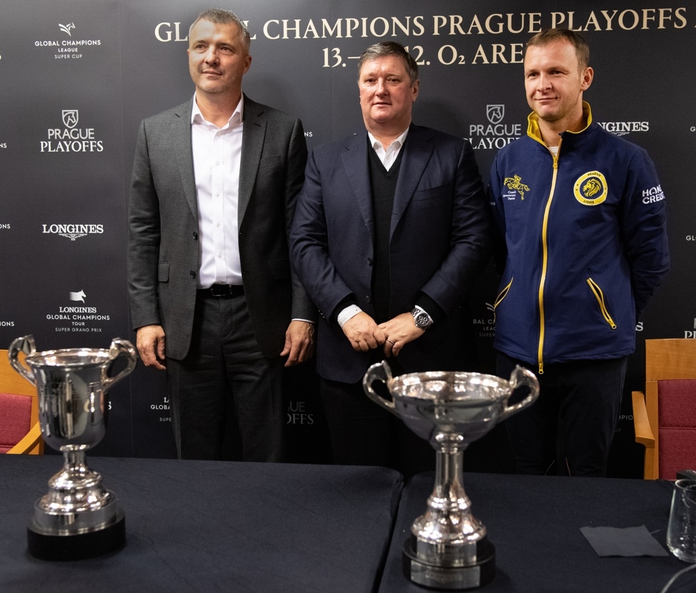 Zakladatel prestižní parkurové série Global Champions Jan Tops den před startem galashow světového parkuru Prague PlayOffs představil novinářům trofeje, které čekají na vítěze týmového Super Cupu i Super Grand Prix jednotlivců.