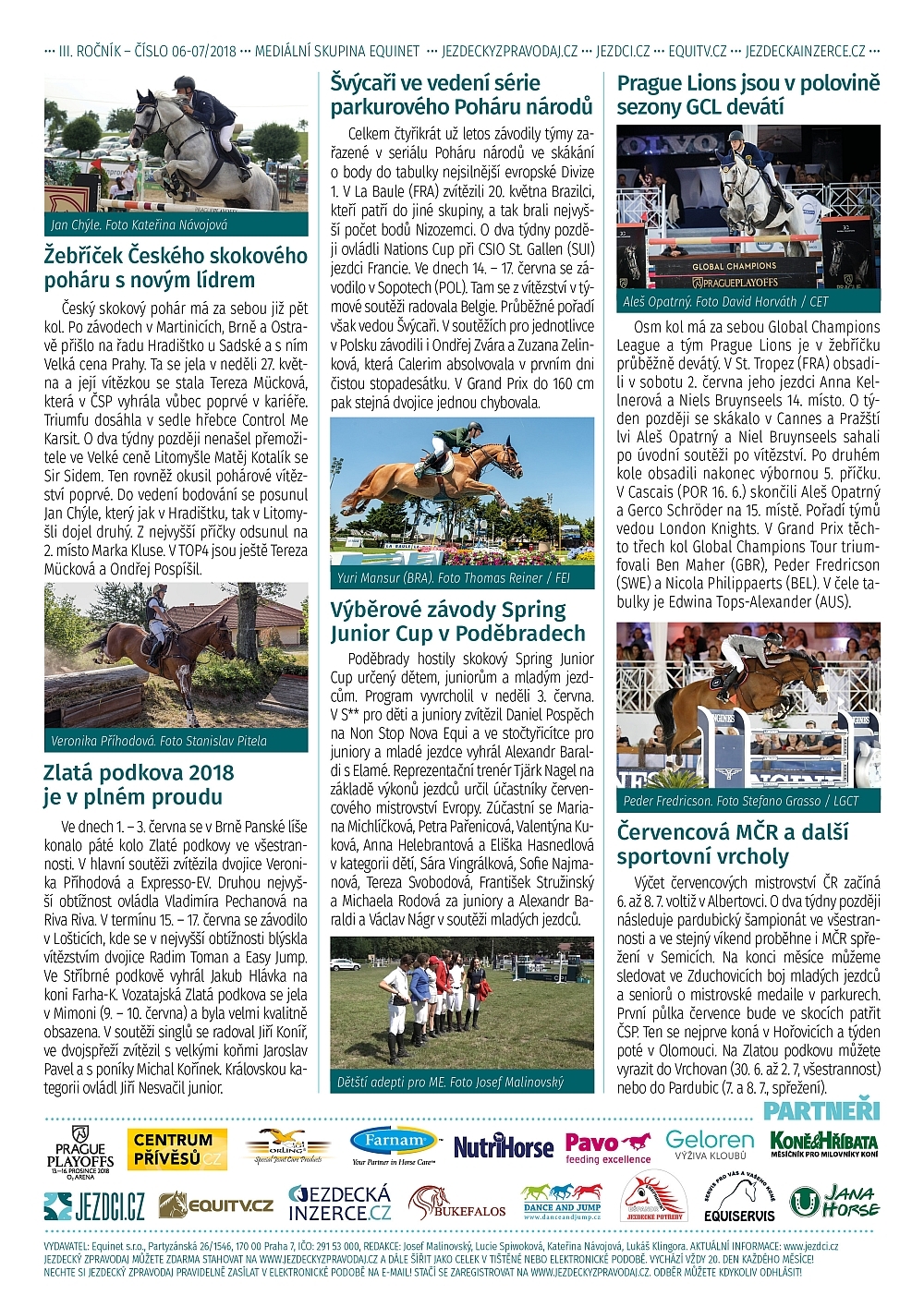 Ze zahraničních kolbišť jsme vybrali závody Global Champions a také CSIO se soutěžemi Pohárů národů. Mnoho zajímavých výsledků českých reprezentantů si můžete připomenout i v rubrice "Krátce". Je to k nevíře, ale to všechno jsme opět zvládli vměstnat do dvou stran.