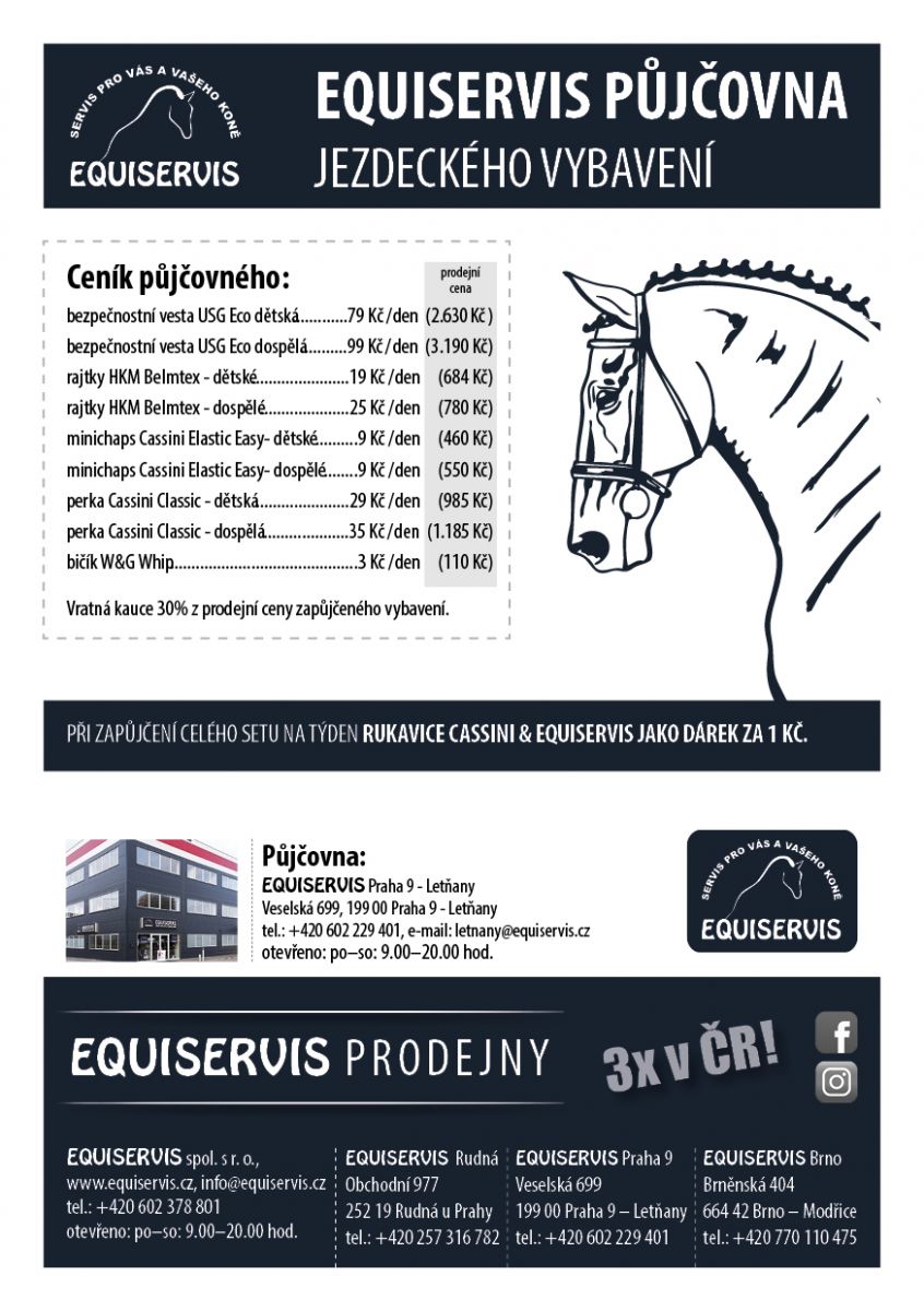 Je vám tato nová služba šitá jako na míru? Chyběl vám právě tento krůček ke splnění snu? Pak je tu pro vás půjčovna a personál Equiservisu, který vám pomůže odborně vybrat padnoucí velikosti. První půjčovnu jezdeckého vybavení najdete na pobočce v Praze – Letňanech (Equiservis, Veselská 699, 199 00, Praha 9). Více informací na www.equiservis.cz/equiservis-pujcovna. Své dotazy můžete směřovat telefonicky (tel.: 602 229 401) nebo e-mailem (letnany@equiservis.cz).