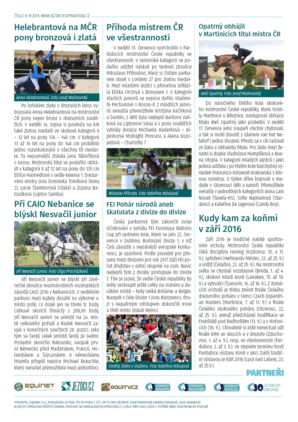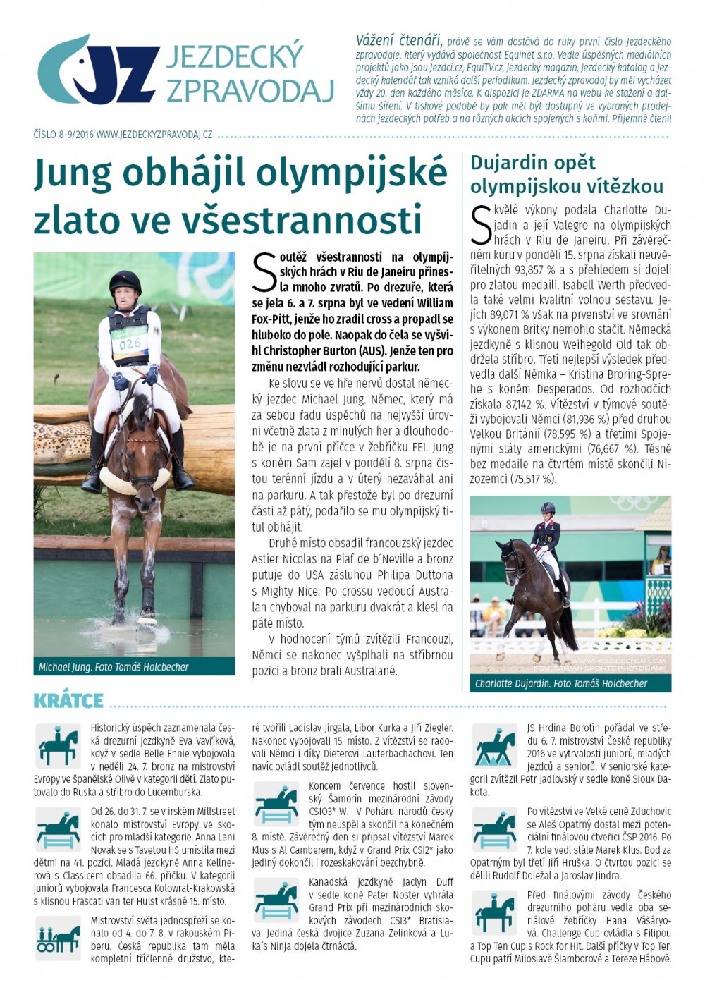 Asi jste zaregistrovali informaci, že společnost Equinet – provozovatel portálů Jezdci.cz a EquiTV.cz – začala vydávat nový Jezdecký zpravodaj, který vychází 1x za měsíc v elektronické i v tištěné verzi. Při TOP akcích mohou vycházet také speciály!