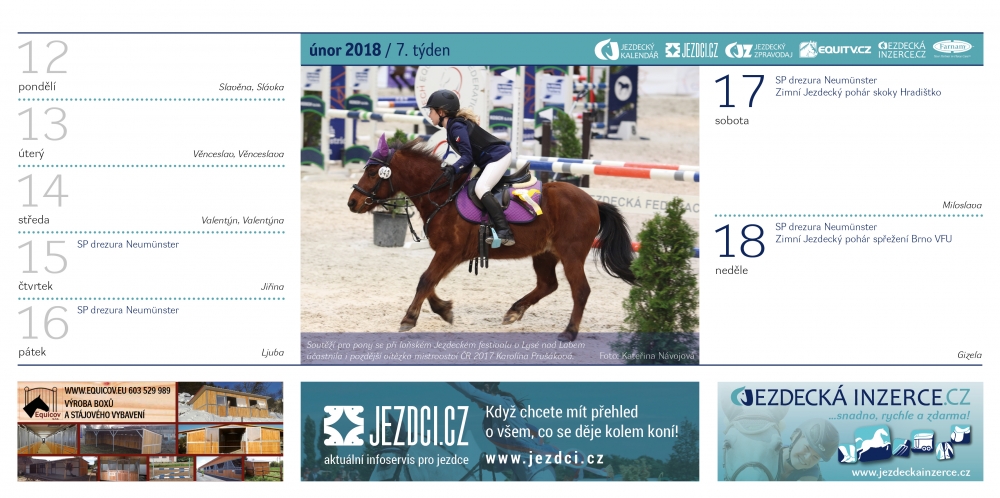 Jezdecký kalendář se od těch ostatních liší tím, že má vyhrazený výrazně větší prostor pro víkendové dny. Navíc jsou v něm uvedeny termíny důležitých jezdeckých akcí v České republice i jinde ve světě!
