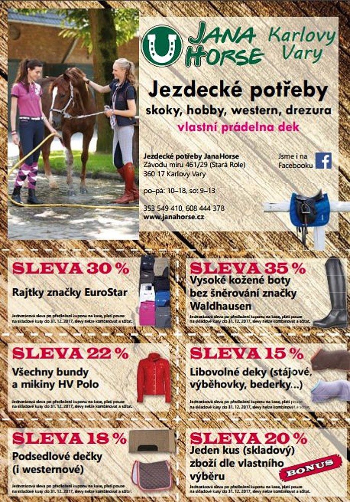 /PR článek/ V letošním vydání Jezdeckého katalogu najdete slevové kupony, které je možné využít k nákupu v obchodě s jezdeckými potřebami JanaHorse v Karlových Varech. Kupony si můžete stáhnout i z webu katalogu!!!