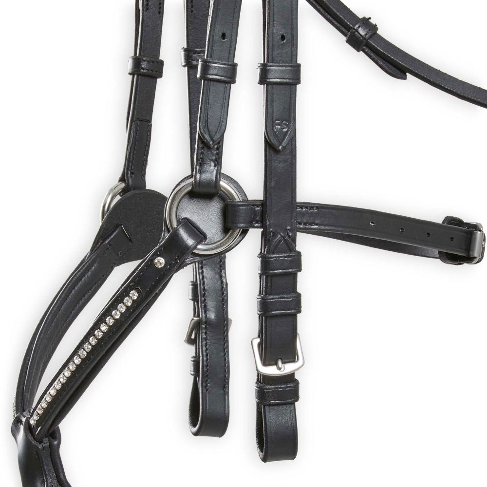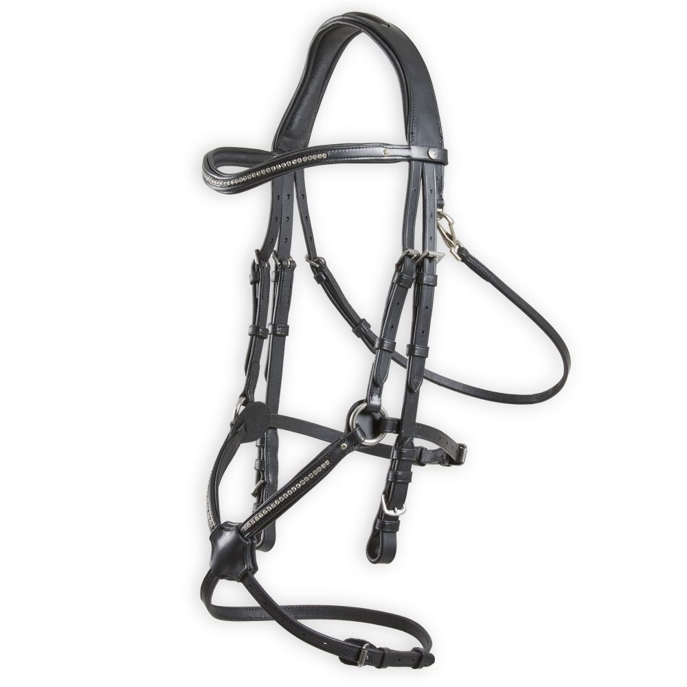 Prvním z nich je černá varianta STRASS pro milovníky lesklých kamínků. Těmi je zdobená nejen čelenka, ale i samotný nánosník. Váš kůň bude zářit i na dálku! Linie uzdečky ve spojení s blyštivými kamínky podtrhují krásu koňského parťáka.