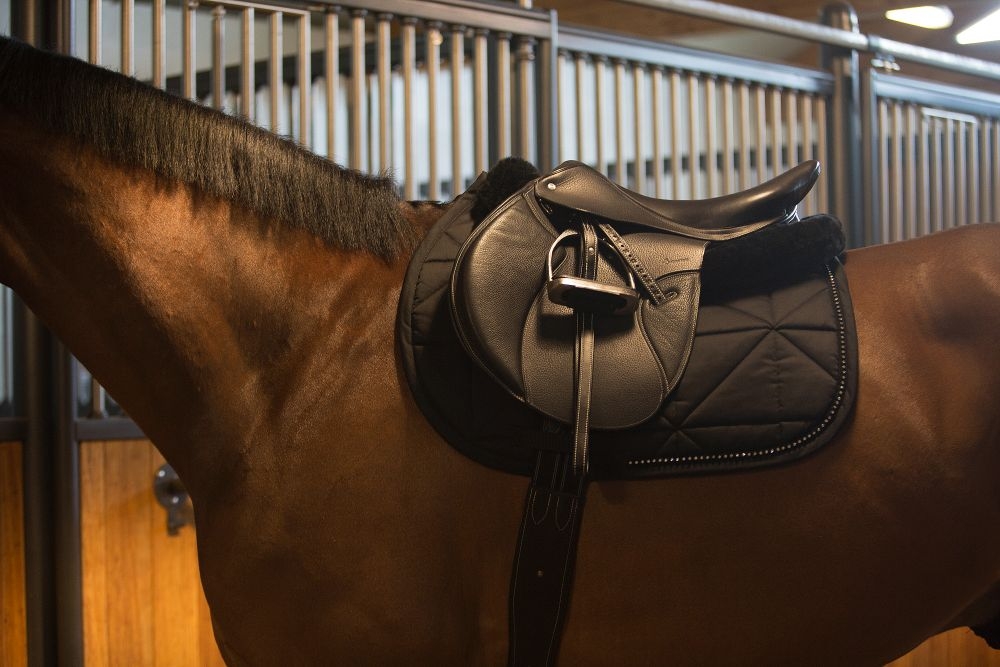 Dalším doplňkem k sedlu je poprsník s martingalem. Jeho zapnutí do sedla je otázkou chvilky díky karabinám. Martingalovou vidlici můžete navíc snadno odepnout a využít pouze poprsák. Právě na plecích krásně vynikne ozdobné prošívání.