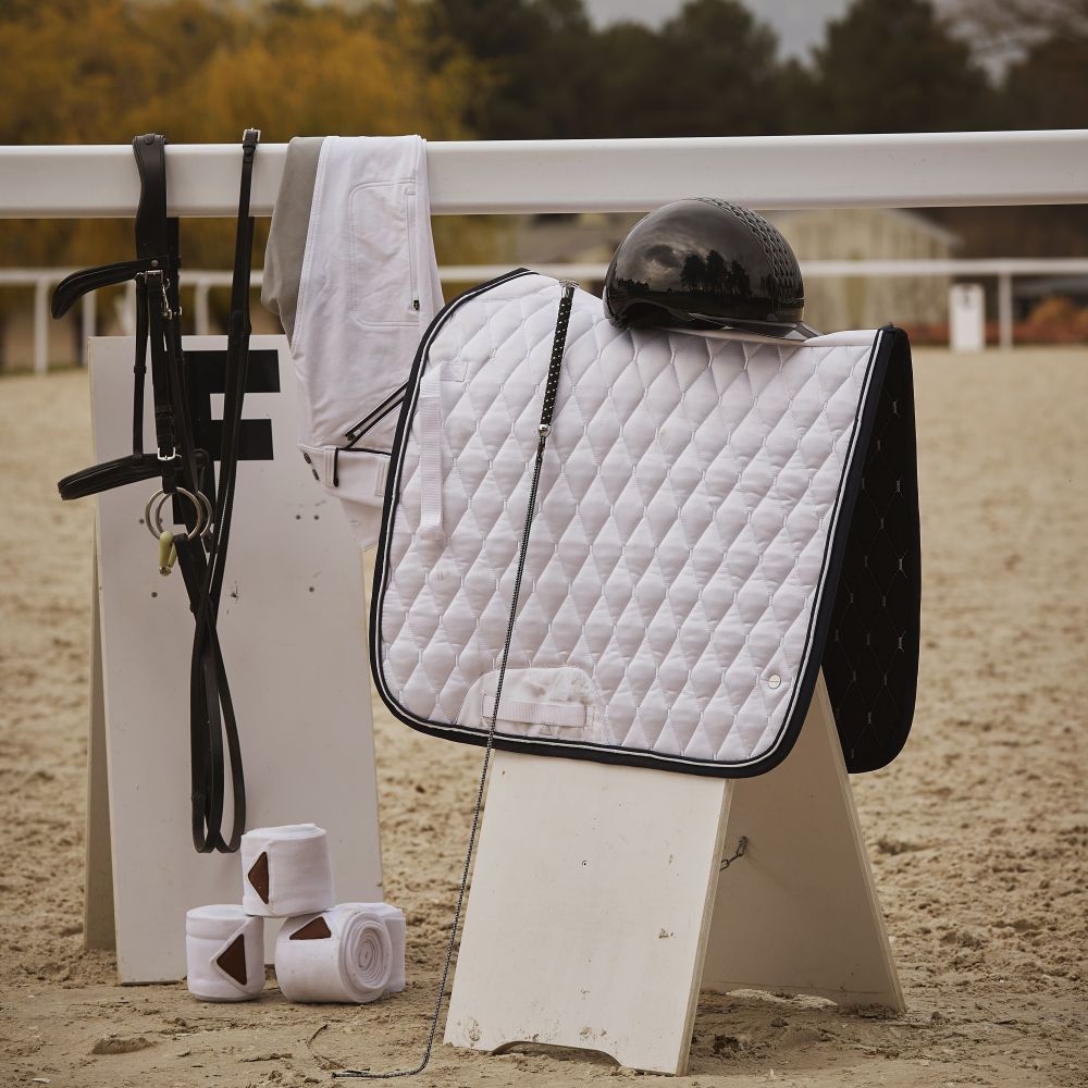 Hlavním produktem celé kolekce je Podsedlová dečka 900. Její lesklý materiál z vrchní strany upoutá pozornost na první pohled. Kosočtvercové prošívání a kontrastní lem dečku ozvláštňují, celkový dojem dokresluje pak malý kulatý štítek s logem Fouganza. Právě tento symbol propojuje celou kolekci a najdeme ho na všech drezurních produktech.