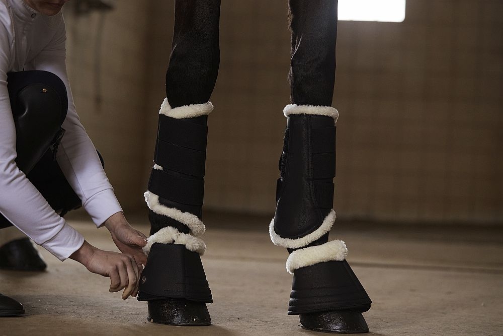 Pro ochranu nohou při tréninku jsme do naší nabídky přidali uzavřené šlachovky, opět vyměkčené syntetickým beránkem. Ten je uvnitř předtvarovaný, proto se chrániče lépe nasazují a při pohybu nepřetáčejí. Lze je použít na přední i zadní nohy. Dvojitá kůže je odolná proti odírání a díky suchému zipu se snadno sundavají.