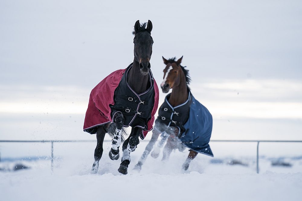 Všechny výběhové deky můžete snadno zkombinovat s ochranou krku nepromokavými nákrčníky. Ty jsou k dispozici ve variantě Light, tedy pouze nepromokavá vrstva bez zateplení, 200 g a 300 g. K dece je rychle připnete pomocí karabin a na krku upravíte suchými zipy.