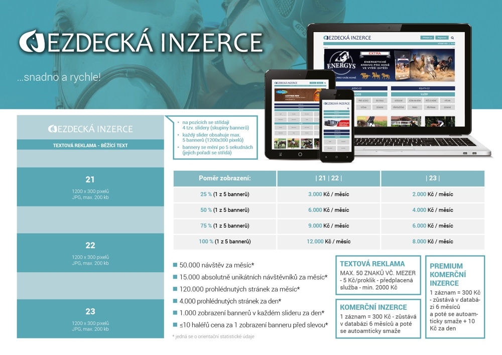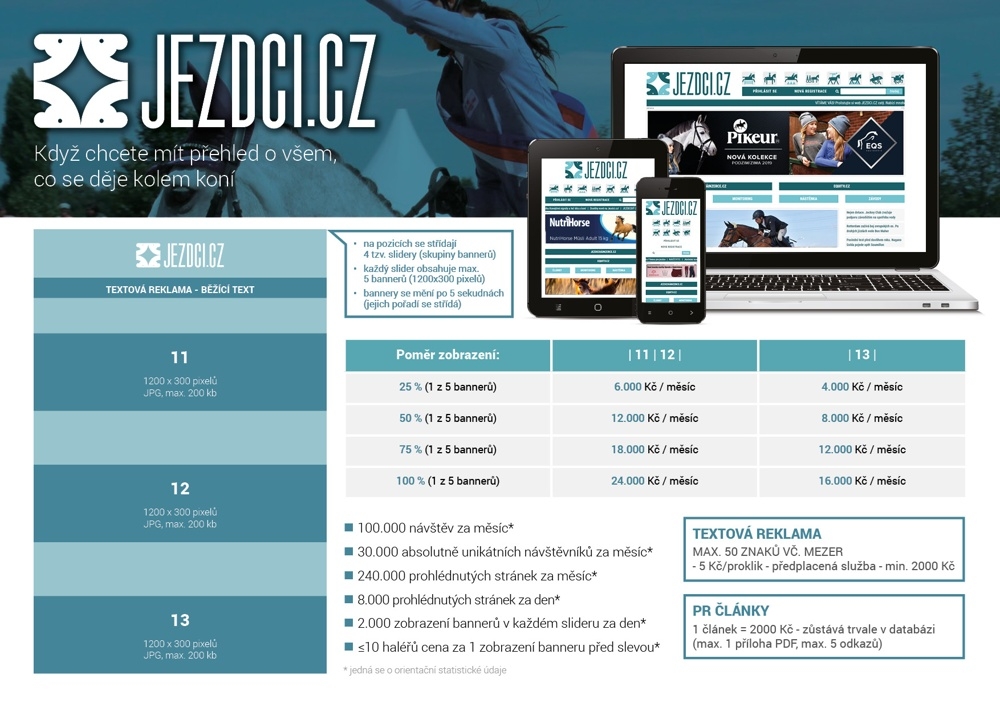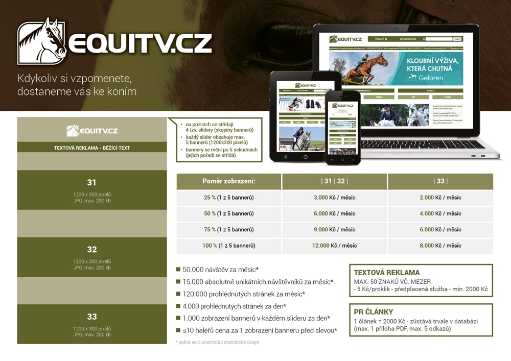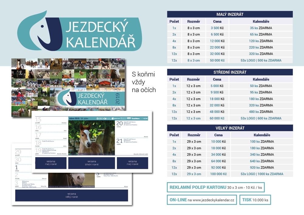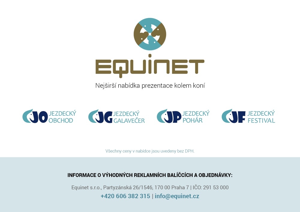 Mediální skupina EQUINET s.r.o. tradičně v září představuje ceník reklamy pro následující rok. Media kit 2020 je zpracován zcela nově v přehledném a snadno srozumitelném formátu. Využijte nejširší nabídky prezentace kolem koní, která opravdu funguje!