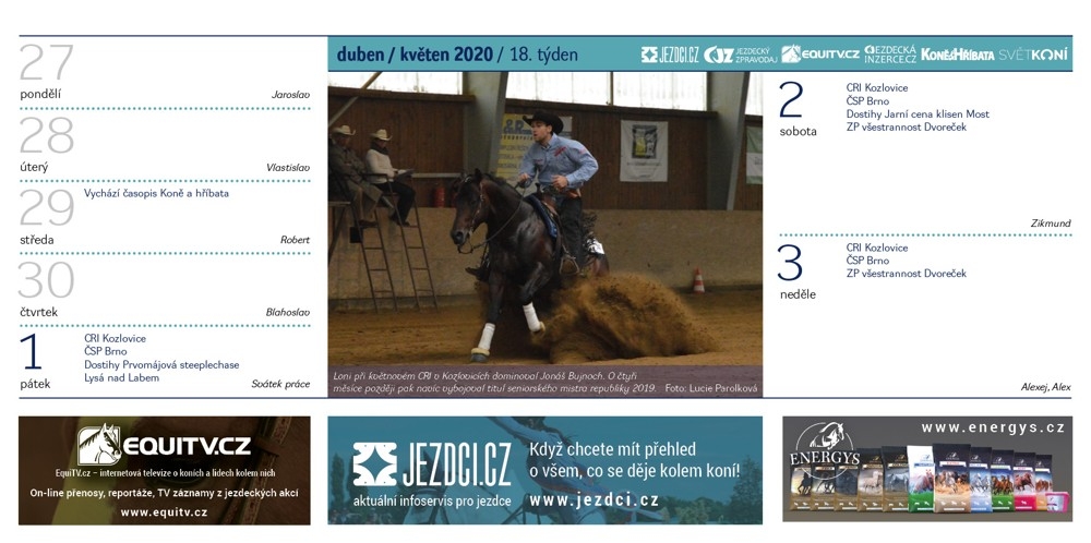 Stejně jako v předchozích letech, ani v roce 2020 nebudete ochuzeni o Jezdecký kalendář, v kterém najdete řadu krásných koňských fotek a také termíny všech důležitých akcí. Objednejte si ho až domů. Třeba jako vánoční dárek.