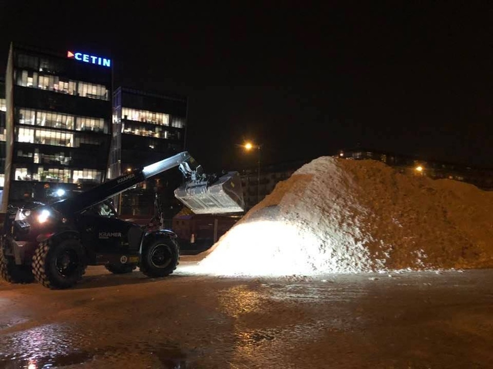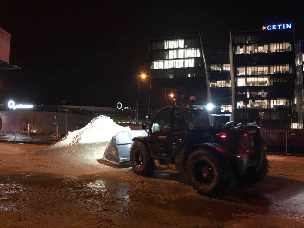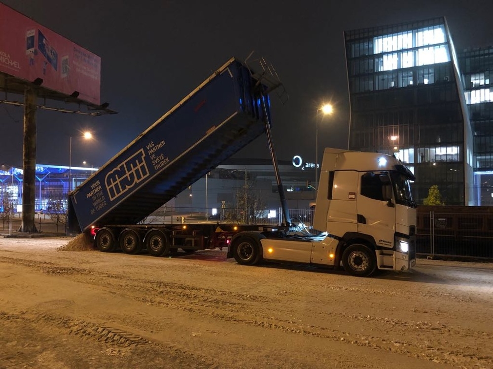 Přesně 35 velkých návěsů dopravilo na přípravnou plochu před libeňskou O2 arenou 1.100 tun křemičitého písku a 17.000 kilogramů geotextilie s vláknem.